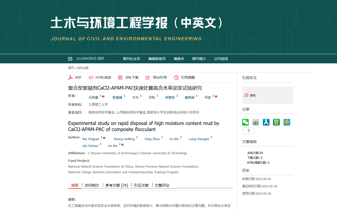 近日,永利集团官网土木工程专业2020级本科生马英建(指导老师:何斌)等同学以我校为第一署名单位,在土木与环境工程领域国内知名期刊《土木与环境工程学报(中英文)》上发表学术论文“复合型絮凝剂CaCl2-APAM-PAC快速处置高含水率泥浆试验研究”。该项成果得到了2022年度国家级大学生创新创业训练计划项目(No:202210112025,淤泥与工程泥浆快速处理絮凝技术及固化剂研发,土木S2001马英建,化工S2001苏彬,土木S2001方舟,化工2004程慧峰,土木S1901梁登钦)等基金的资助。