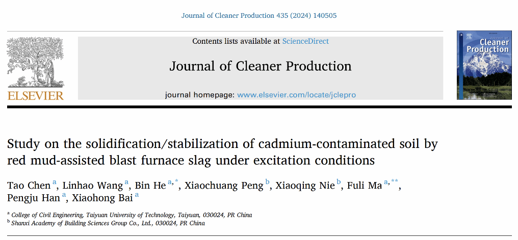 近日,永利集团官网2022级学术型硕士研究生陈涛在国际知名期刊《Journal of Cleaner Production》发表了题为《Study on the solidification/stabilization of cadmium-contaminated soil by red mud-assisted blast furnace slag under excitation conditions》的研究论文,导师何斌为通讯作者,yl23411永利集团官网为第一作者单位。