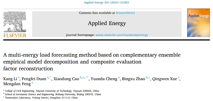 近日,永利集团官网2022级硕士研究生李康在国际知名期刊《Applied Energy》发表了题为《A multi-energy load forecasting method based on complementary ensemble empirical model decomposition and composite evaluation factor reconstruction》的研究论文,李康为第一作者、导师段鹏飞为通讯作者,建筑环境控制与可持续能源应用团队程远达、薛庆雯等为共同作者,yl23411永利集团官网为第一作者单位。
