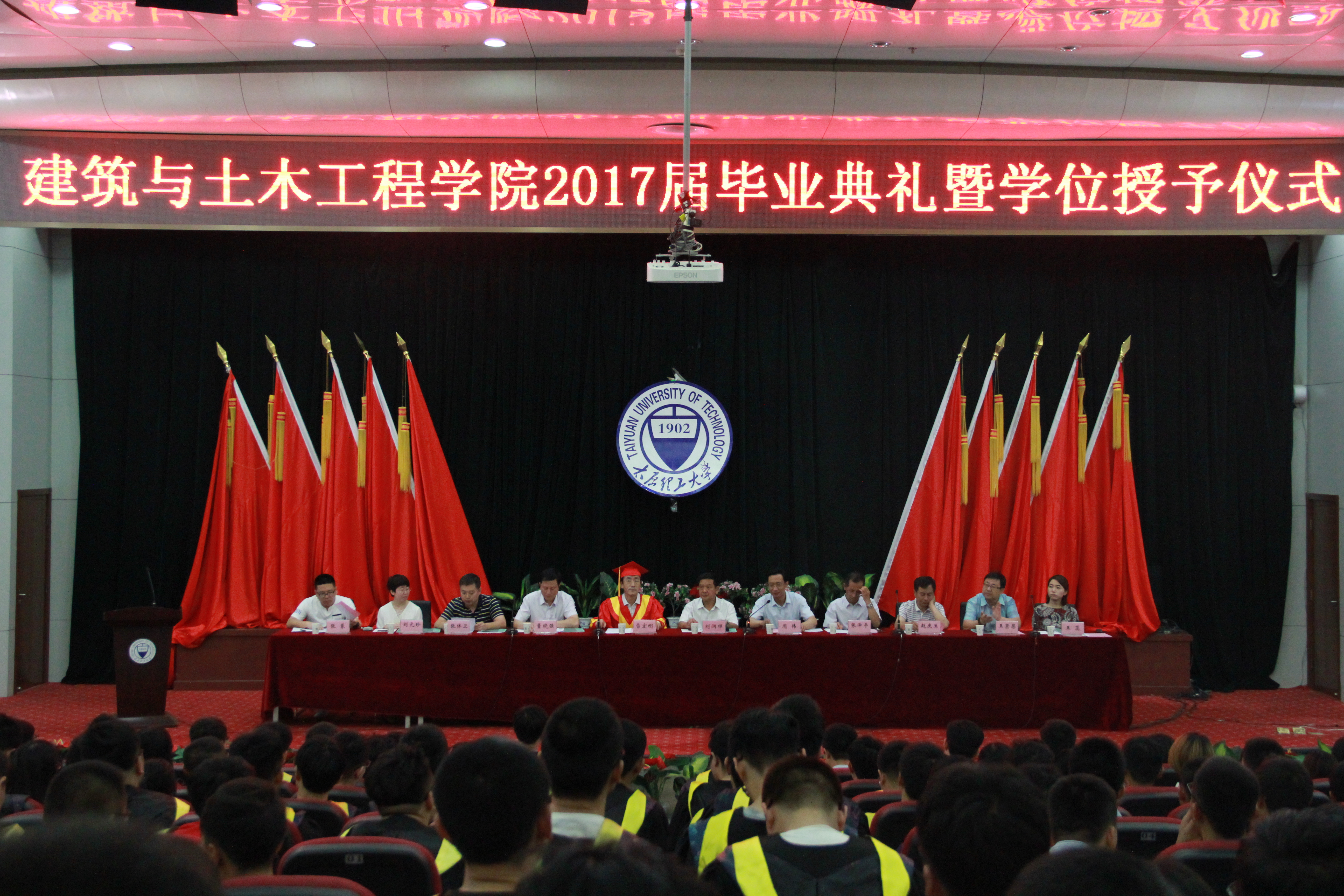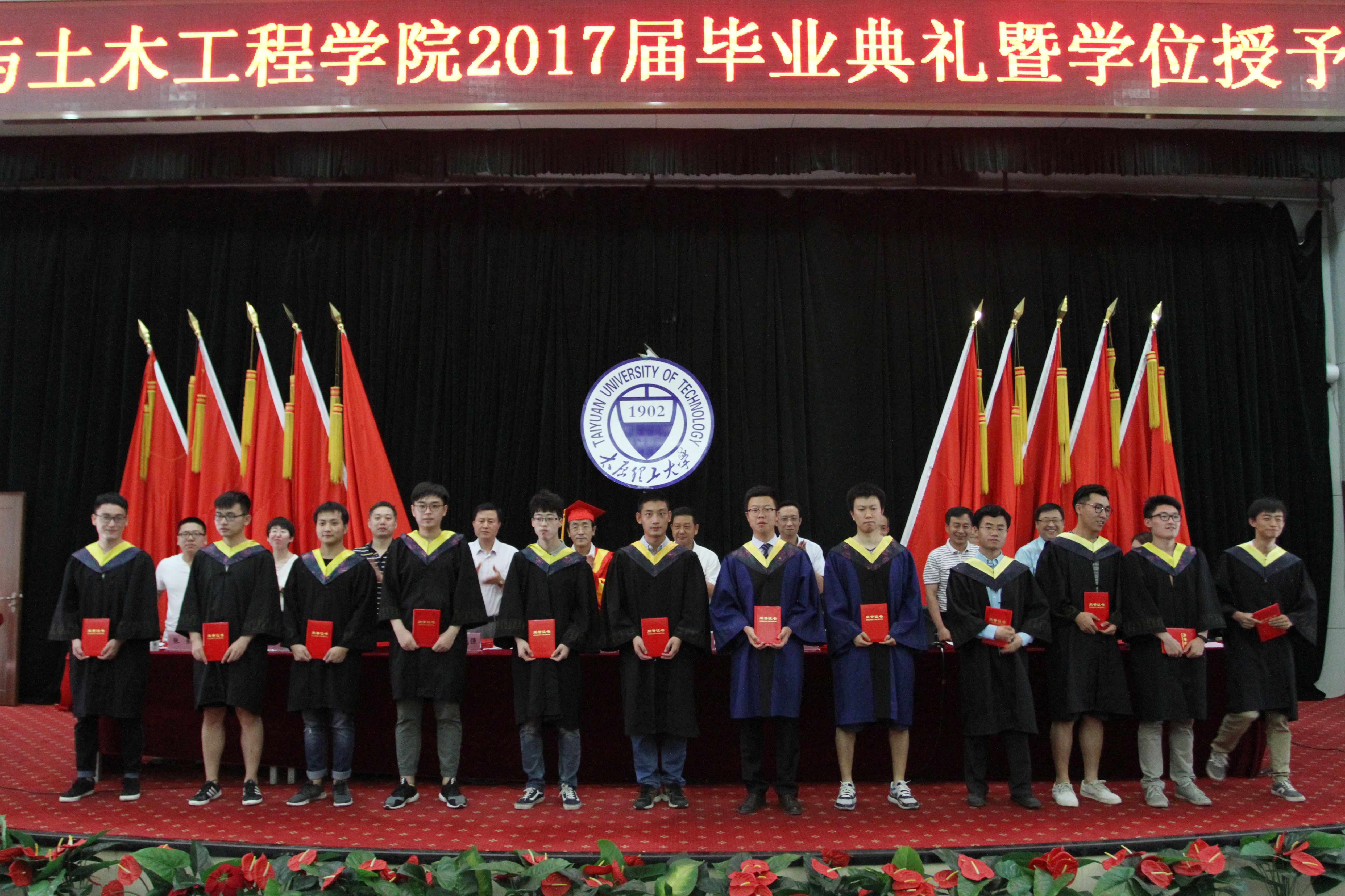 毕业典礼在国歌声中拉开帷幕。副院长张泽平宣读优秀毕业生学生名单,学工办主任张体卫通报了建工学院2017届毕业生就业情况。团委书记张蒙宣读毕业生优秀学生干部名单,领导和老师为12名毕业生优秀学生干部和49名优秀毕业生颁奖。