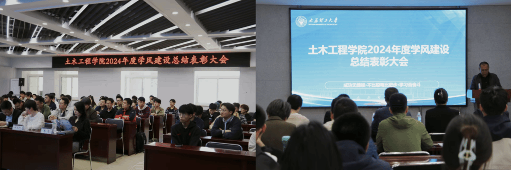 随后,芦倩副书记围绕学院学情展开了细致剖析。她强调,学院以“四链聚合”战略为引领,创新实施“一二三五”教学联动工作法,借助辅导员查课、动态督查、学情分析会等手段,精准发力,有效提升了学风管理效能。同时,学院还精心打造“土木问道”“大国砼心”等思政品牌,优化学风生态。接下来,会议进入颁奖环节,对在过去一年中表现突出的先进集体和个人进行了表彰。会议最后,学生代表土木2101白兆雄作为优秀学生代表发言,分享自己的学习经验和成长感悟。