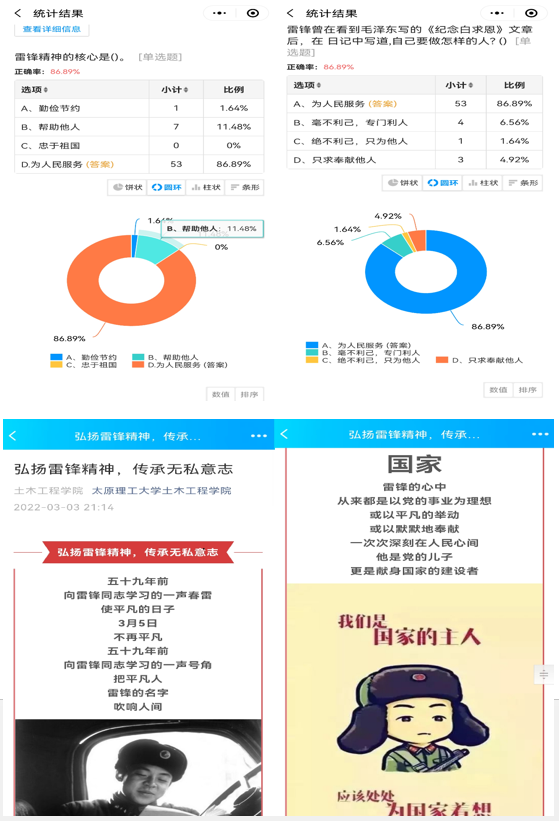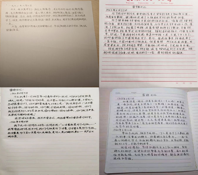与此同时,学院开展了“学习雷锋精神”线上知识问答活动,旨在提升学生对雷锋精神和志愿服务精神的认识,使学生的思想得到升华。在线上,学院官方公众号发布了“学习雷锋精神,传承无私意志”专题推文,进一步引导学生学雷锋人,做雷锋事。并且,为了更加深刻地感受雷锋同志的一言一行,同学们积极抄录雷锋日记,感悟了雷锋内心真实的感情向往。