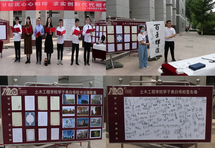 随后,土木学子分别以“年级接龙表白”、“诗歌朗诵表白”、“书法创作表白”、“校歌合唱表白”、“签名留言表白”等方式为母校送上祝福。120年的追求永无止境,沧海桑田,常青的是土木学子乘风破浪的坚定信念,学院本研学生精神饱满,声音洪亮,依次表达对母校的祝福和热爱。配乐诗朗诵《自豪的回响》情感真挚,意气昂扬,流露出土木学子作为太理人的无上荣光。泼墨挥毫迎校庆,笔势酣畅现深情,现场书法创作展现了土木学子对母校发自肺腑的祝愿。“巍巍太行,莽莽吕梁,表里山河是我们华夏的脊梁。”, 嘹亮的校歌合唱,彰显的是土木学子奋发有为的生气,以及对母校发自内心的颂扬。字字真诚,句句动人,醒目的签名留言印证着土木学子对母校的集体告白。至此,表白仪式接近尾声,现场师生在书法摄影展前驻足参观,并集体合影作为留念。