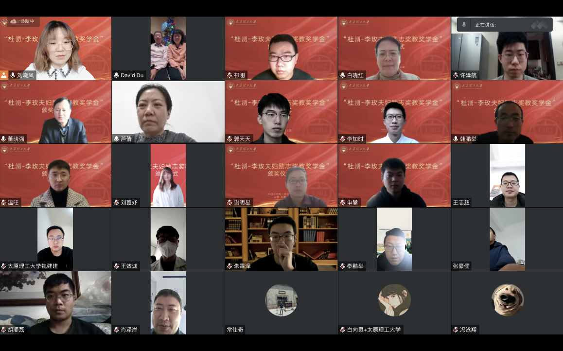 颁奖仪式上,芦书记对2021年获奖师生在2022年取得的成果进行了总结汇报。随后,奖教奖学金评审委员会主席白晓红教授宣读了2022年“杜湧-李玫夫妇励志奖教奖学金”获奖名单,刘晓凤、谢明星两位教师获得“杜湧-李玫夫妇励志奖教金”;郭天天、祁刚、李加时、温旺、刘鑫妤、申攀六位在读研究生获得“杜湧-李玫夫妇励志奖学金”。白晓红教授和杜湧-李玫夫妇为获奖师生进行了颁奖,并对获奖师生提出了祝贺与殷切关怀,获奖师生表示了诚挚的谢意。