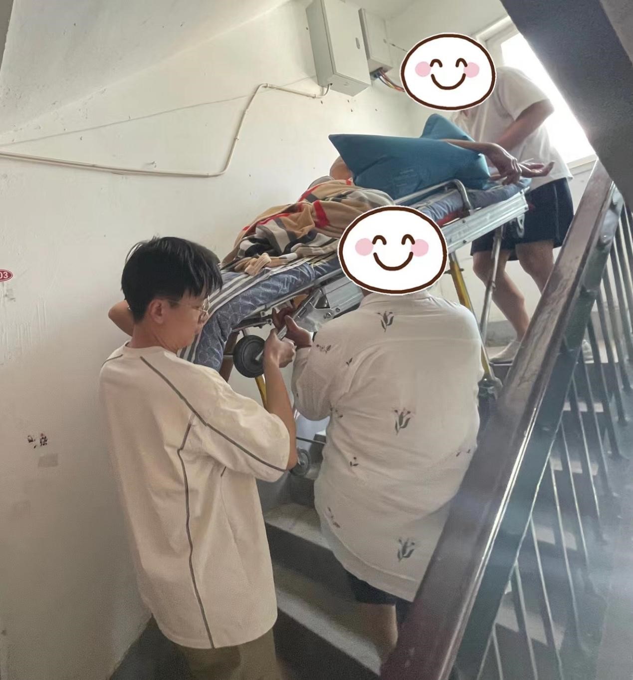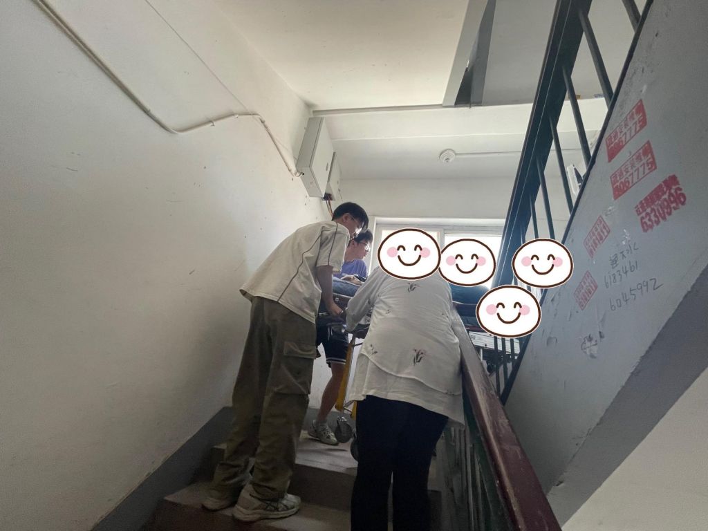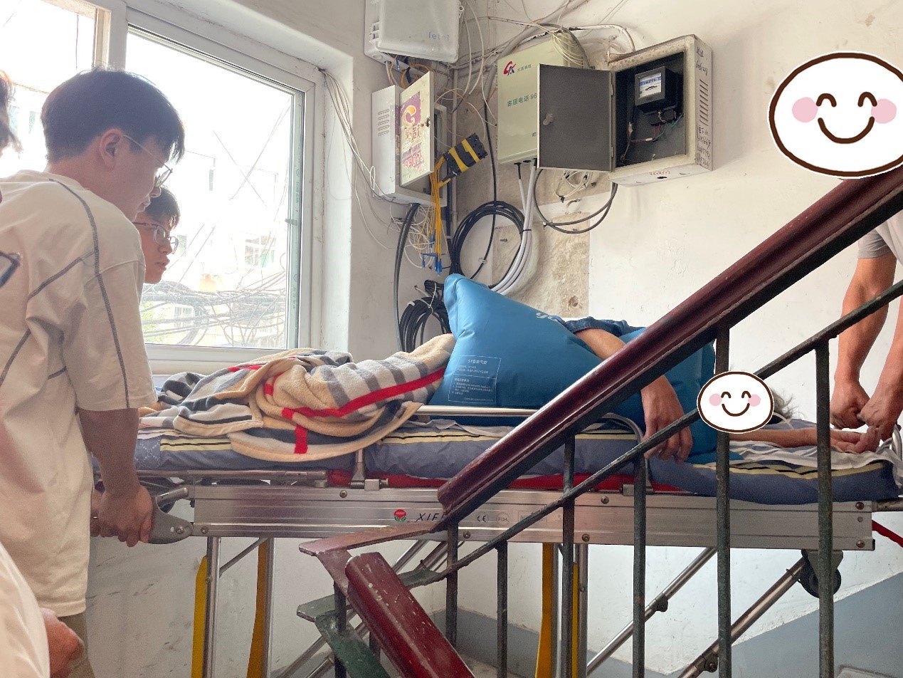 2024年6月13日中午11点半,土木第一研究生党支部书记柳丽接到一名yl23411永利集团官网教职工的求助信息,对方称其居住在yl23411永利集团官网西院住宅小区无电梯的住宅楼4楼,其家属中午12点将从医院治疗出院归来,但由于行动不便依旧卧于担架车上,而其他男性亲友有事无法前来,该名教职工及女性家属将出院家属抬上楼存在困难,所以希望能得到志愿者的帮助。柳丽同志在了解具体情况后,随即号召支部张鹏昆、曹培格、岳中华、张凯4名党员,积极承担抬担架助群众回家的“伸出援手,照亮他人”志愿服务,大家没来得及吃午饭便前往yl23411永利集团官网西院住宅小区进行帮忙。