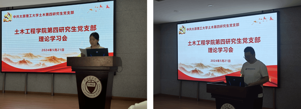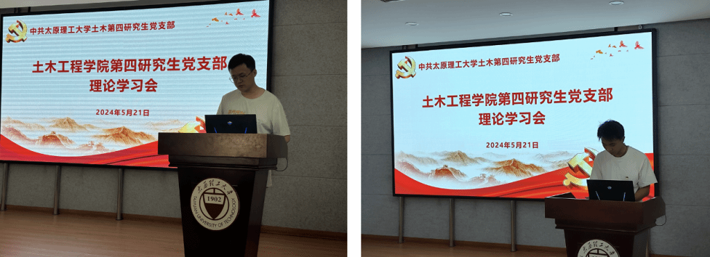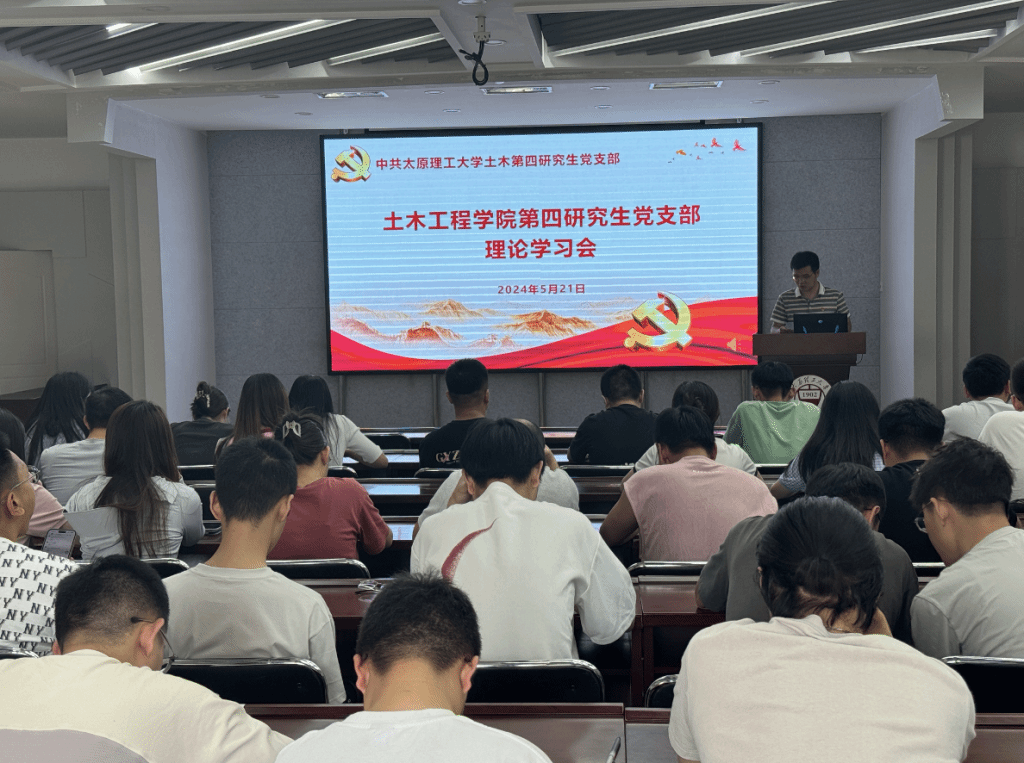 2024年5月21日下午,土木第四研究生党支部在学院五层会议室召开党纪学习教育专题学习会,深入学习宣传贯彻习近平总书记五四青年节对全国广大青年寄语精神,并认真学习贯彻习近平总书记关于党纪学习教育的重要讲话精神和重要指示精神,组织学习新修订的《中国共产党纪律处分条例》。会议由宣传委员王浩宇主持,支部书记邱斌、支部组织委员李赟及土木第四研究生党支部全体党员参加。